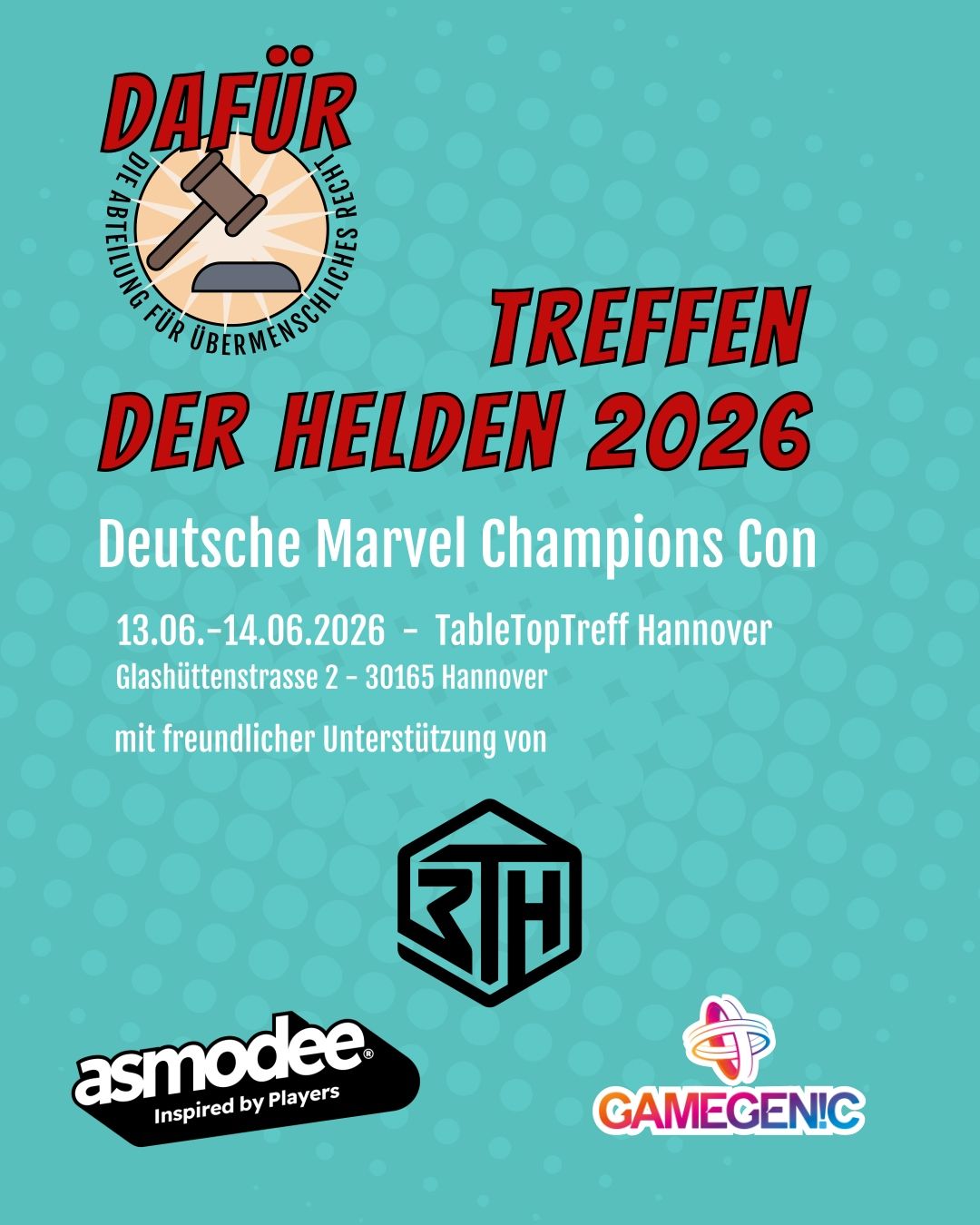 | 13-14.6. | Hannover | Treffen der Helden – Deutsche Marvel Champions Con (Mehr Infos auf Facebook) | |