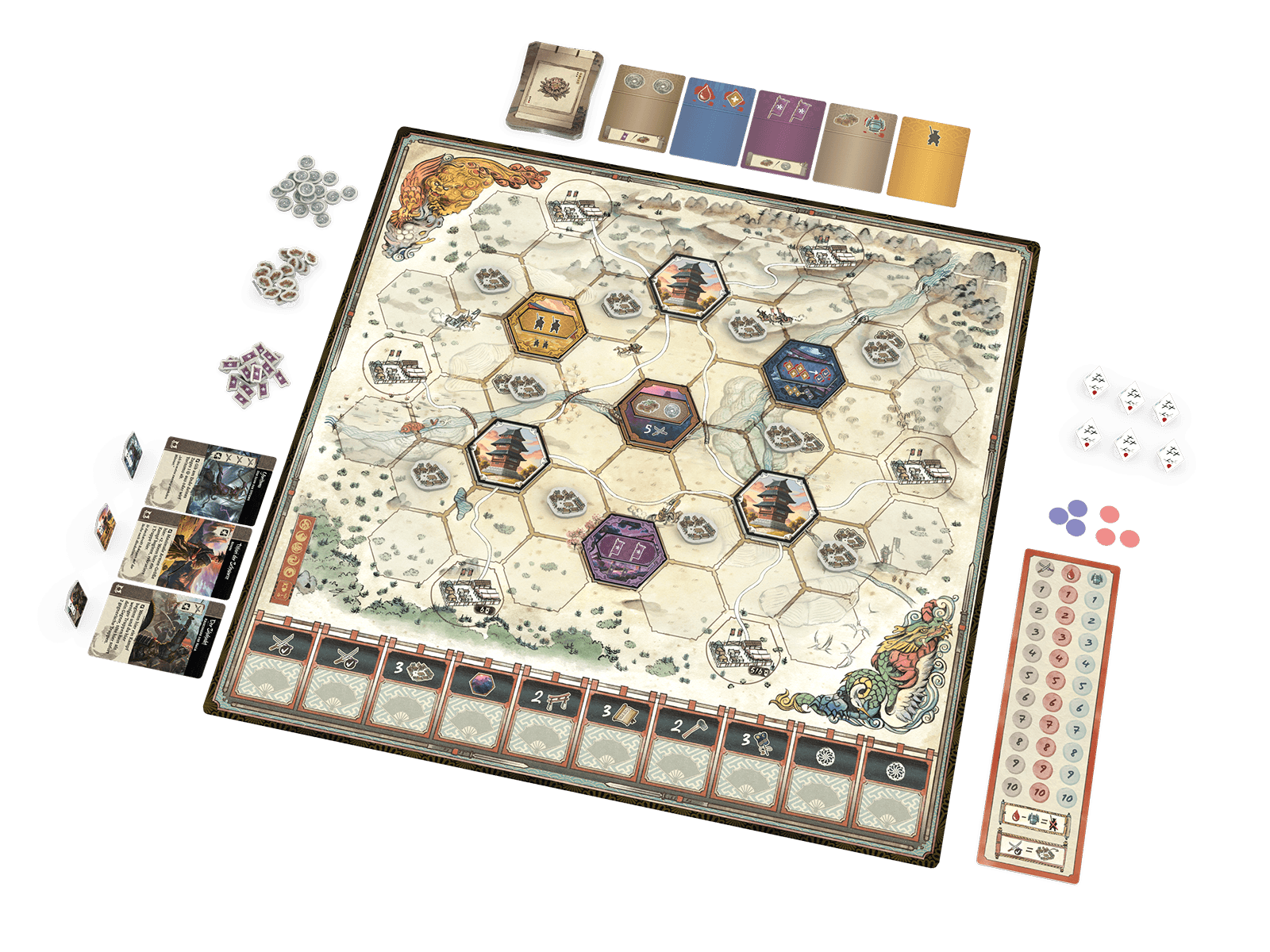 Rekrutiert legendäre Samurai, sichert euch mächtige Karten und erweitert euer Einflussgebiet, um zuerst sieben Erfolge zu erringen. Mit cleverem Engine-Building und taktischem Area Control führt ihr euer Reich zum Sieg – oder unterliegt der Übermacht eurer Rivalen.