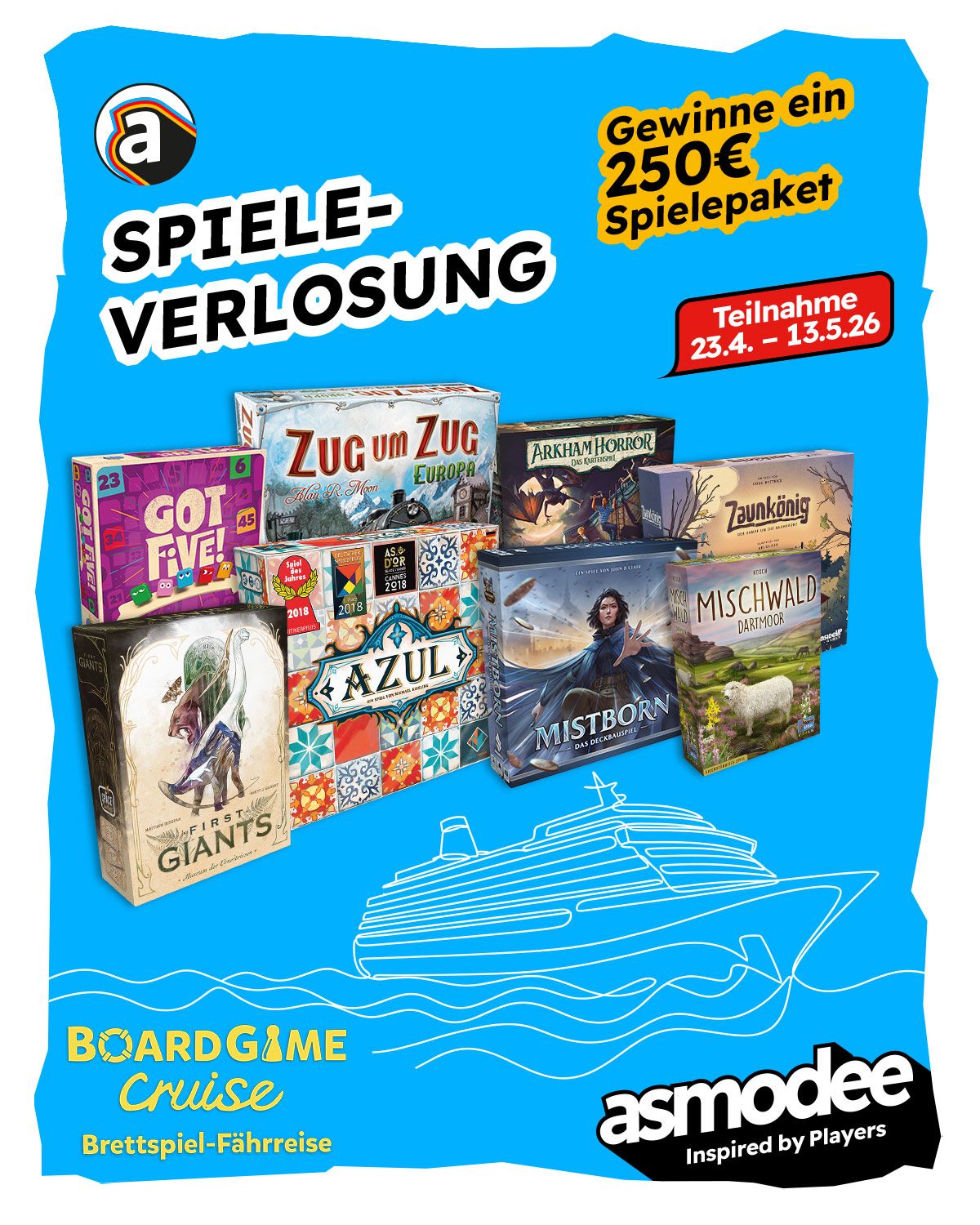 Zusammen mit der @boardgamecruise verlosen wir ein XXL-Spielepaket aus 8 Brettspielen – vollgepackt mit Highlights & Neuheiten! (Teilnahmebedingungen)