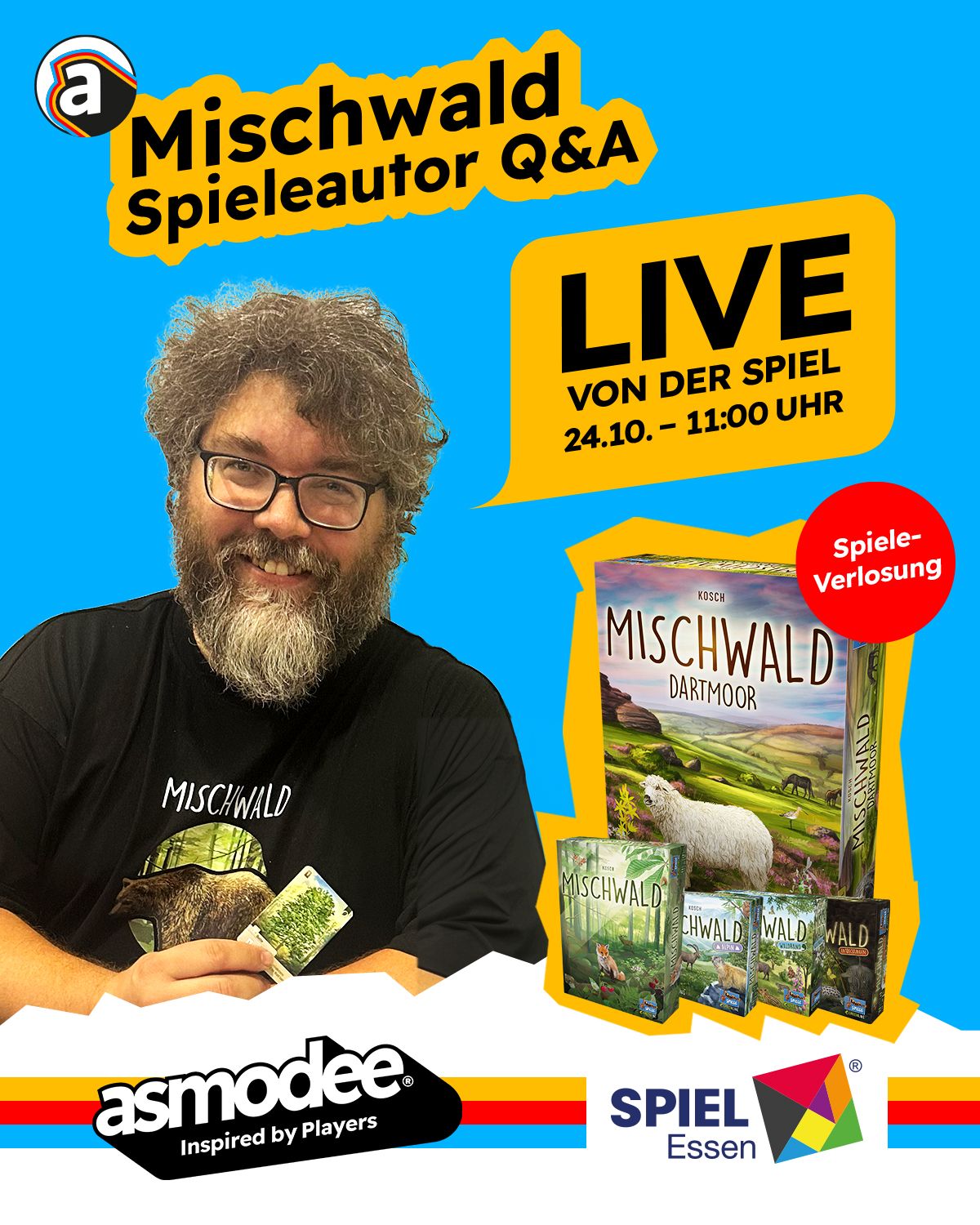 Folgt uns auf YouTube @asmodeeDe, aktiviert die Benachrichtigungen und seid dabei, wenn es heißt: „Mischwald: Dartmoor – live von der SPIEL 2025!“
