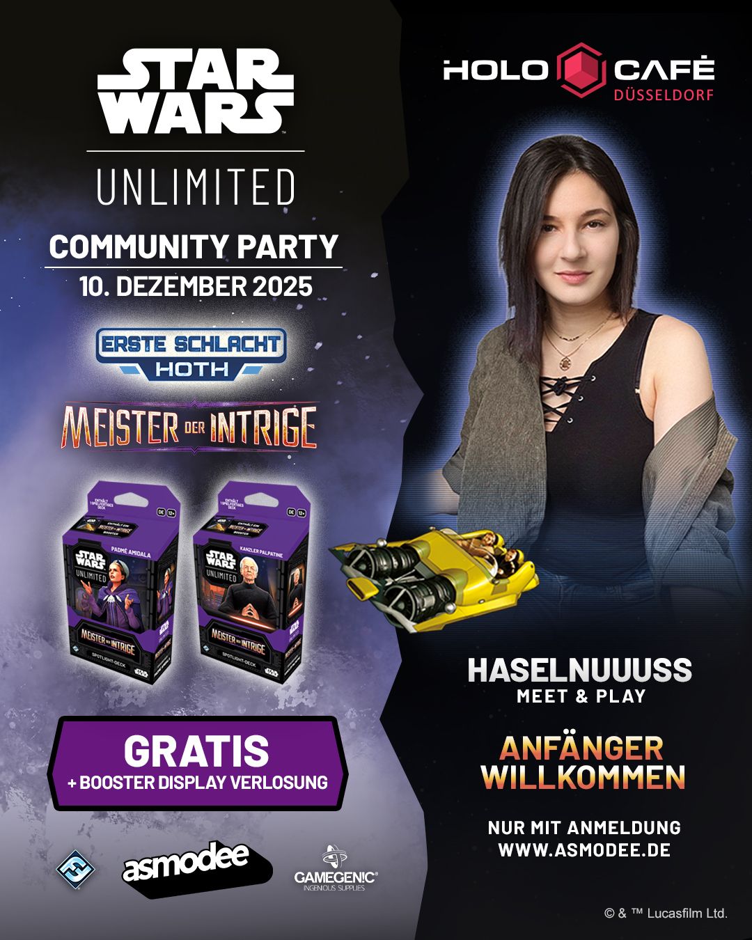 Taucht bei unserer Community Party ein in die Welt von Star Wars: Unlimited mit „Erste Schlacht: Hoth“ und dem brandneuen 6. Set „Meister der Intrige“. Egal, ob ihr bereits erfahrene TCG-Generäle seid oder einfach neugierig auf das Spiel – hier ist jeder willkommen.